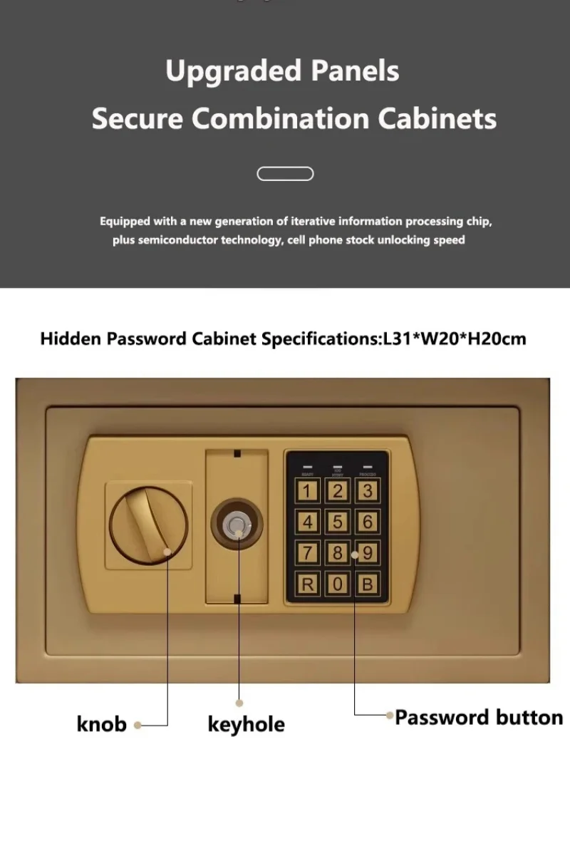 It has a knob for easy operation, a keyhole for emergency access, and a password button for secure password entry, providing